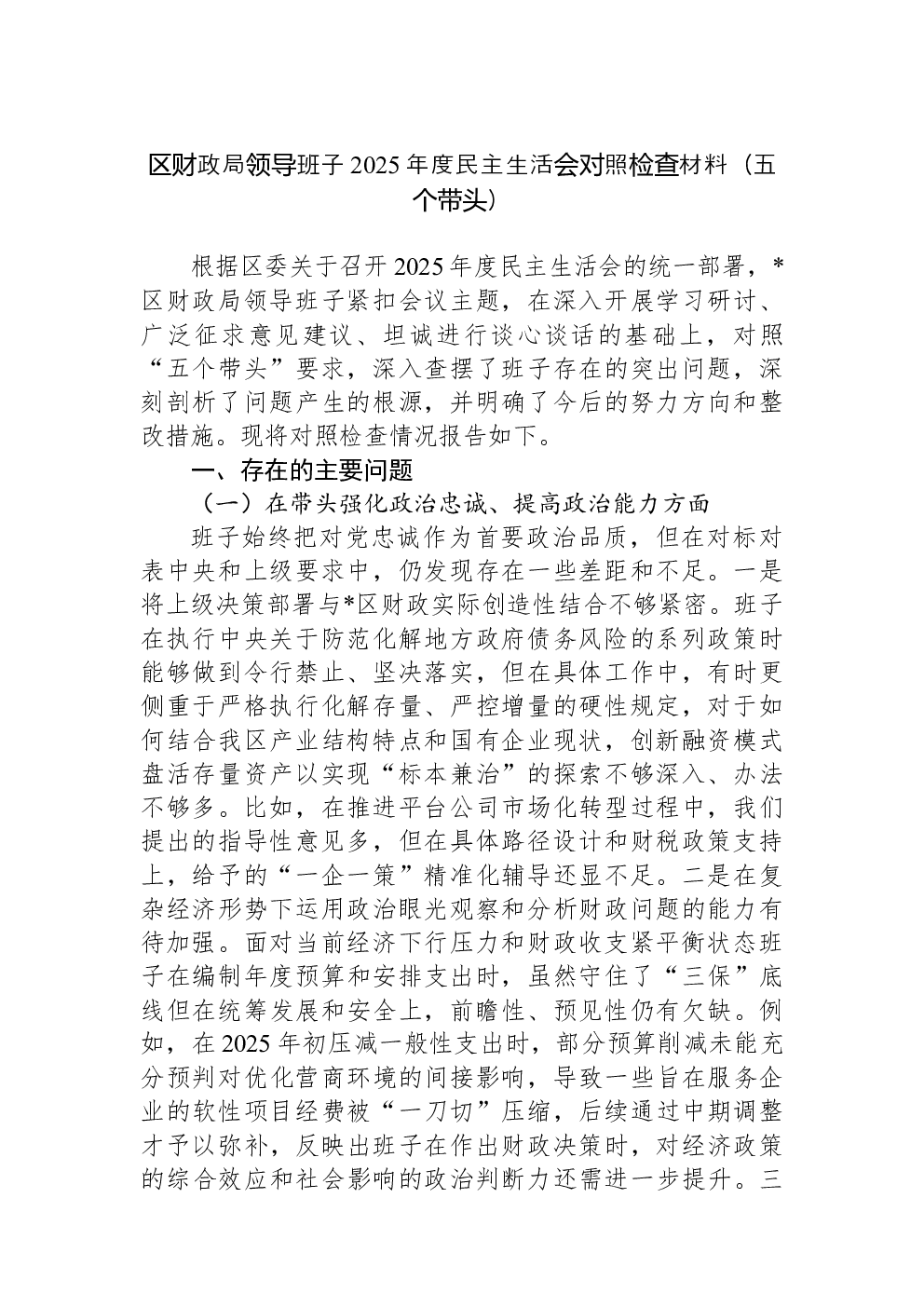 领导班子2022年民主生活会(六个带头)对照检查材料