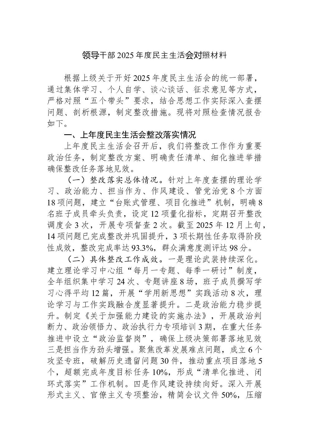 领导班子2022年民主生活会(六个带头)对照检查材料