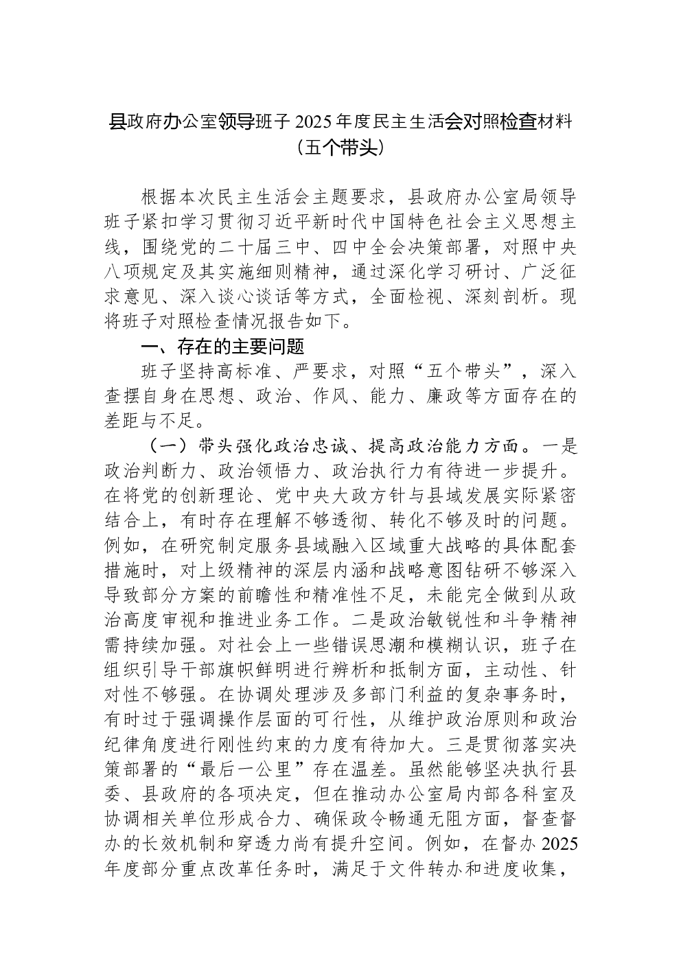 领导班子2022年民主生活会(六个带头)对照检查材料