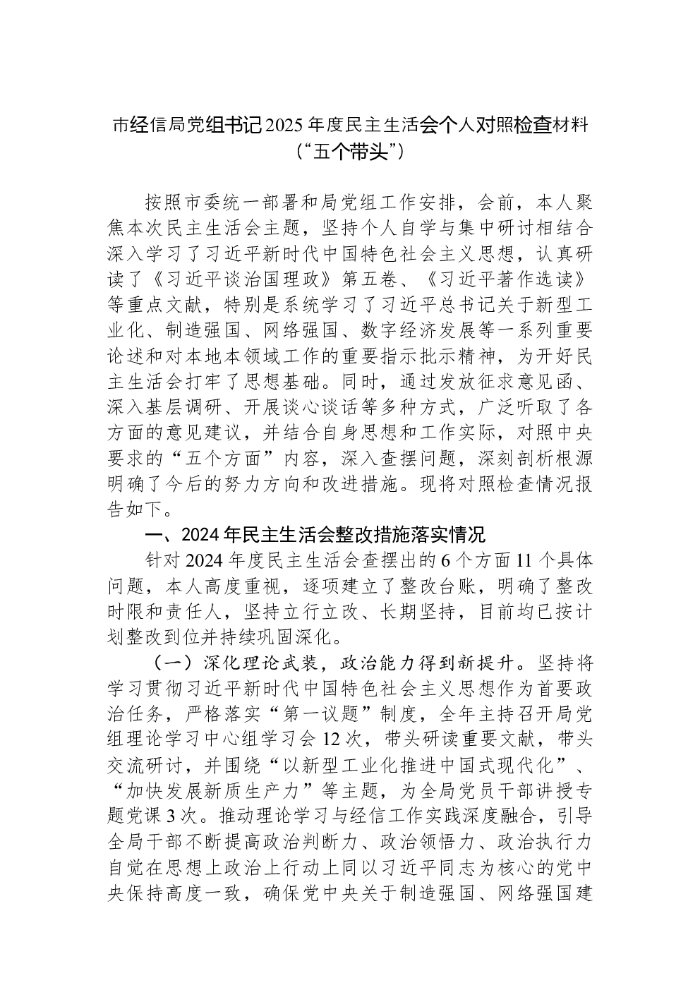 领导班子2022年民主生活会(六个带头)对照检查材料