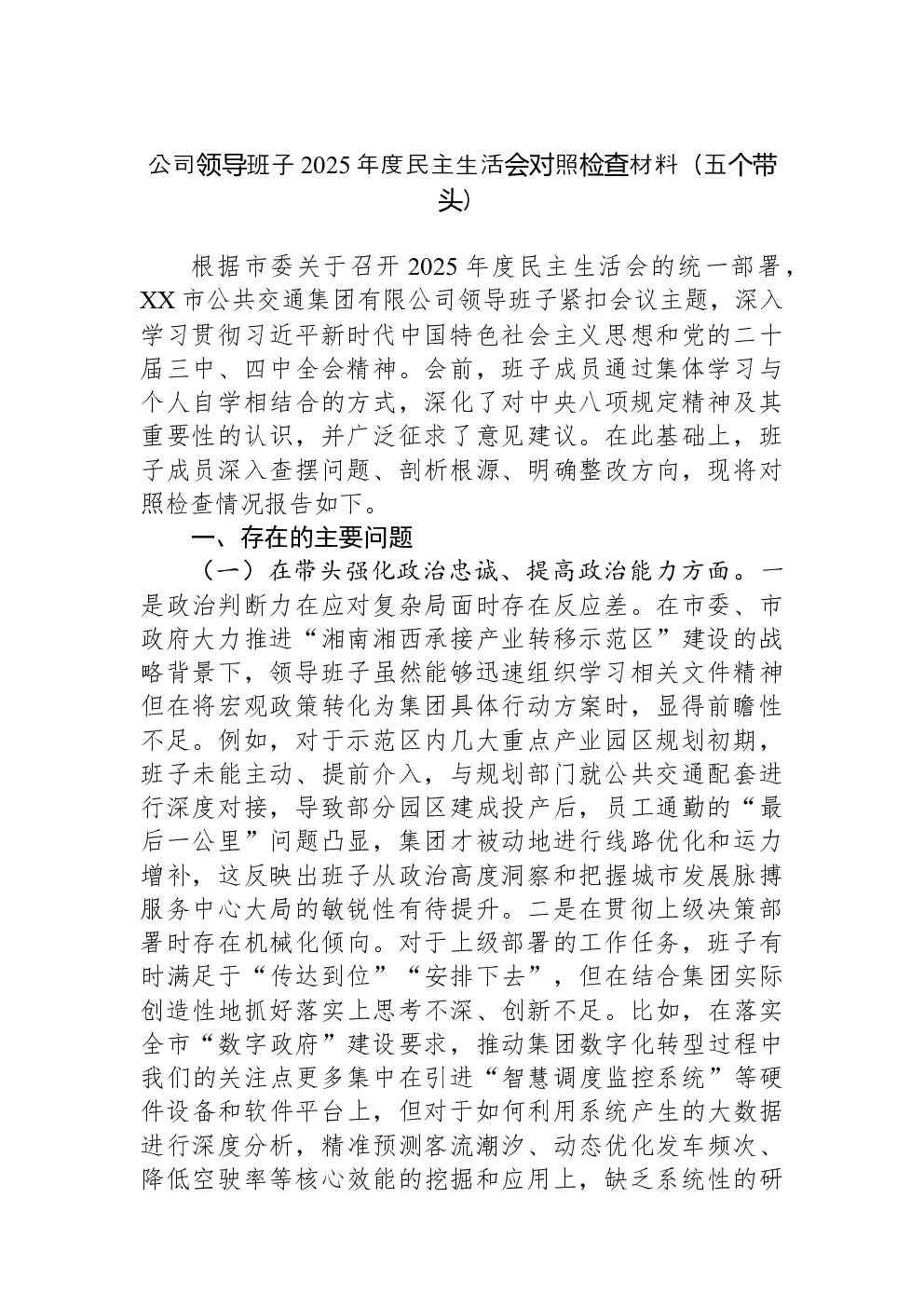 领导班子2022年民主生活会(六个带头)对照检查材料