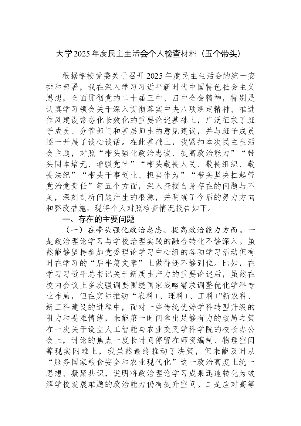 领导班子2022年民主生活会(六个带头)对照检查材料