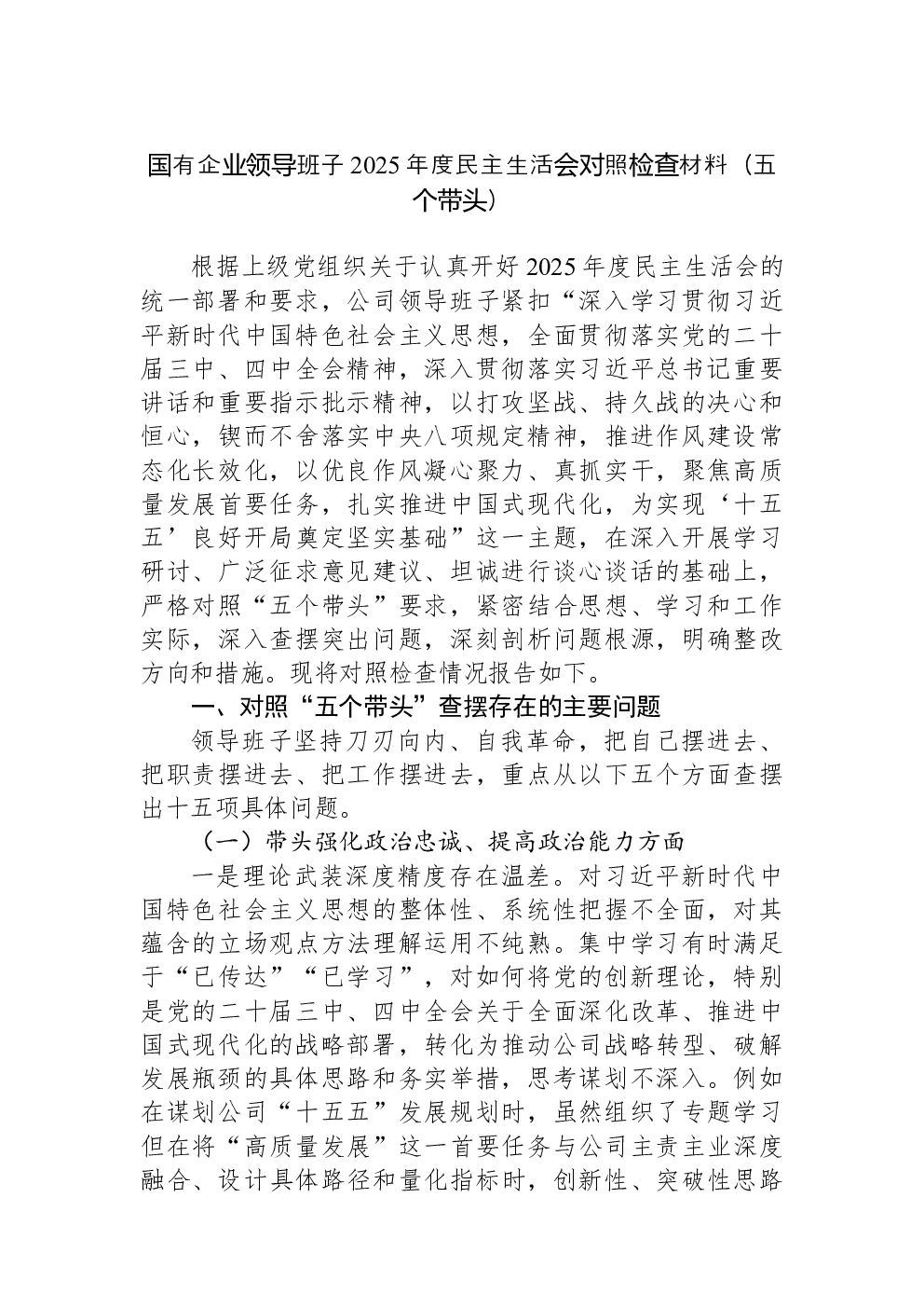 领导班子2022年民主生活会(六个带头)对照检查材料