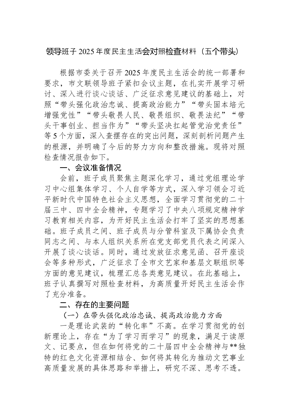 领导班子2022年民主生活会(六个带头)对照检查材料