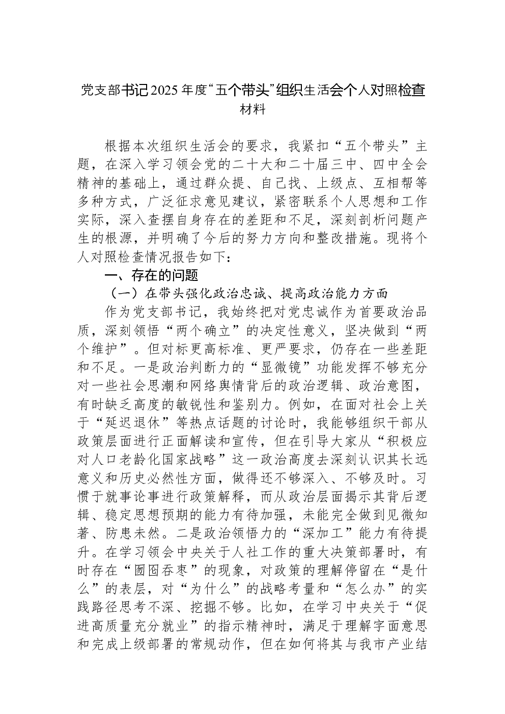 2022年度组织生活会个人对照检查材料(党员对照六个方面)