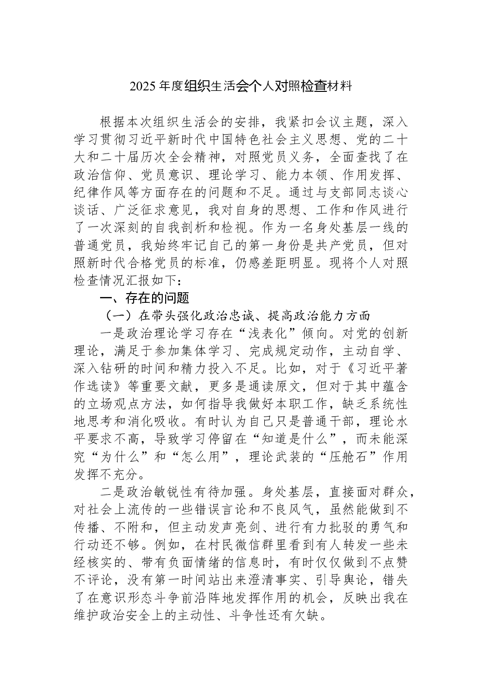 2022年度组织生活会个人对照检查材料(党员对照六个方面)