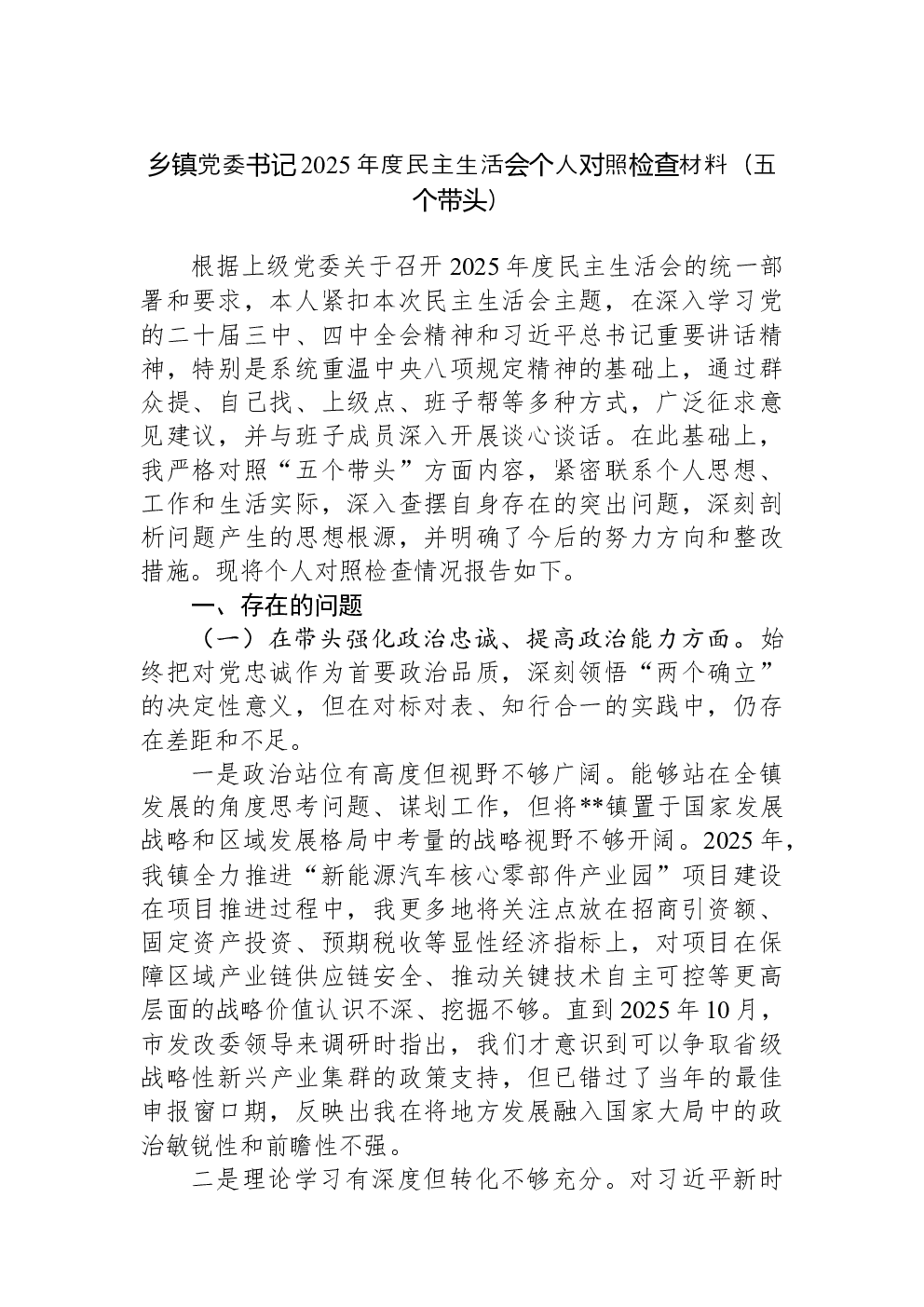 (22篇)2022年度民主生活会六个带头对照检查材料