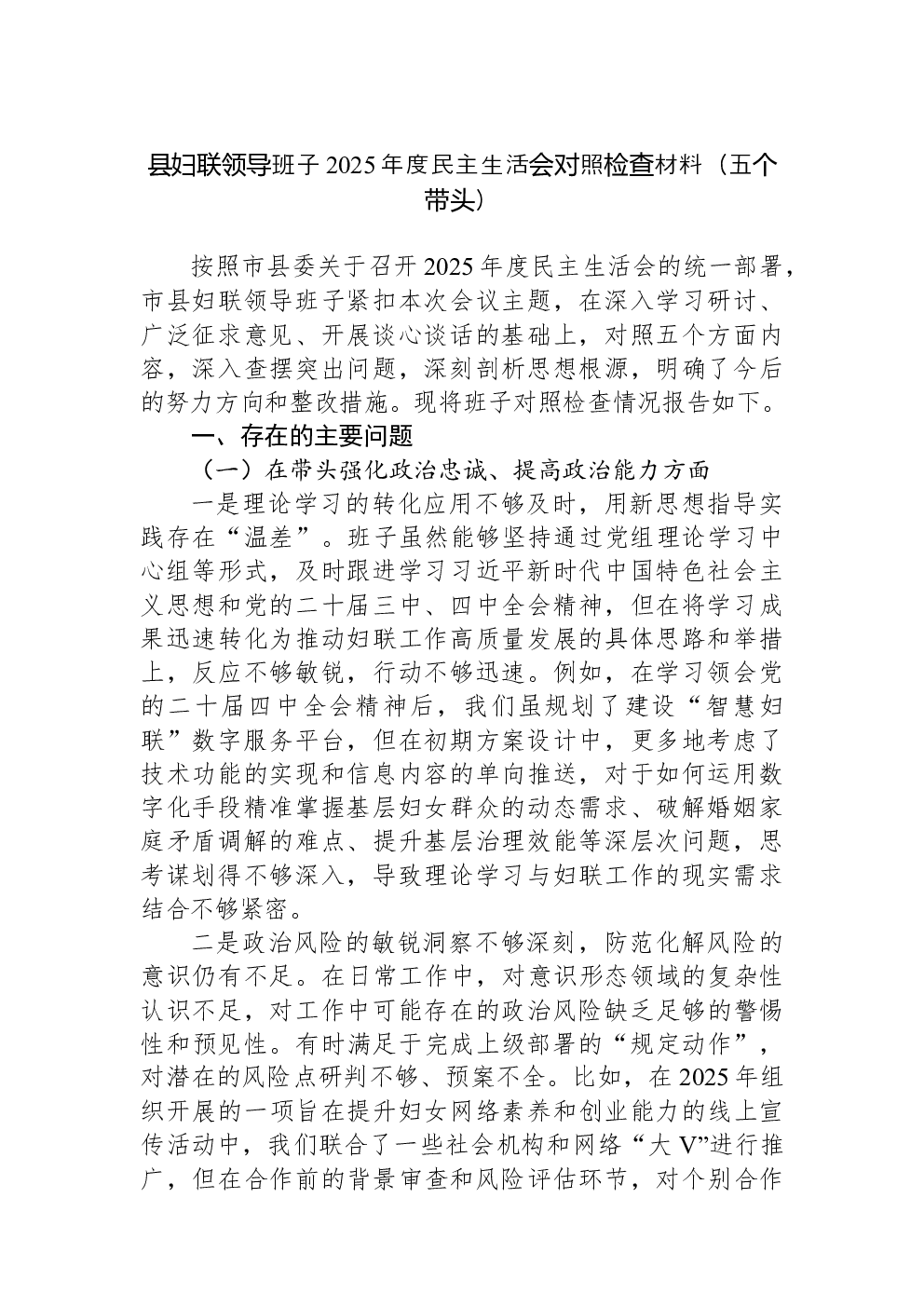 领导班子2022年民主生活会(六个带头)对照检查材料