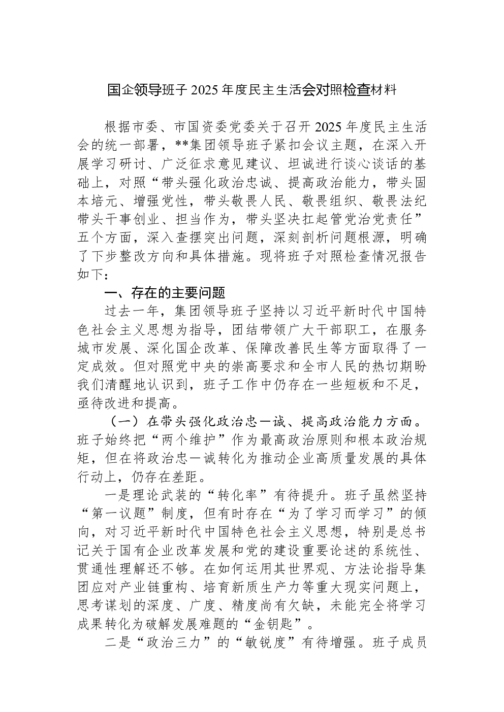 领导班子2022年民主生活会(六个带头)对照检查材料