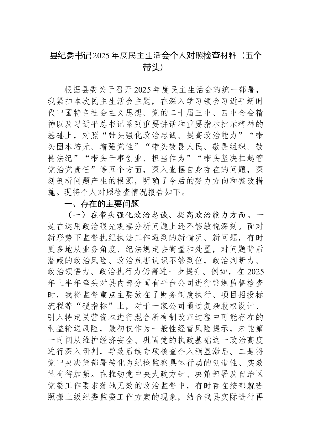 (22篇)2022年度民主生活会六个带头对照检查材料