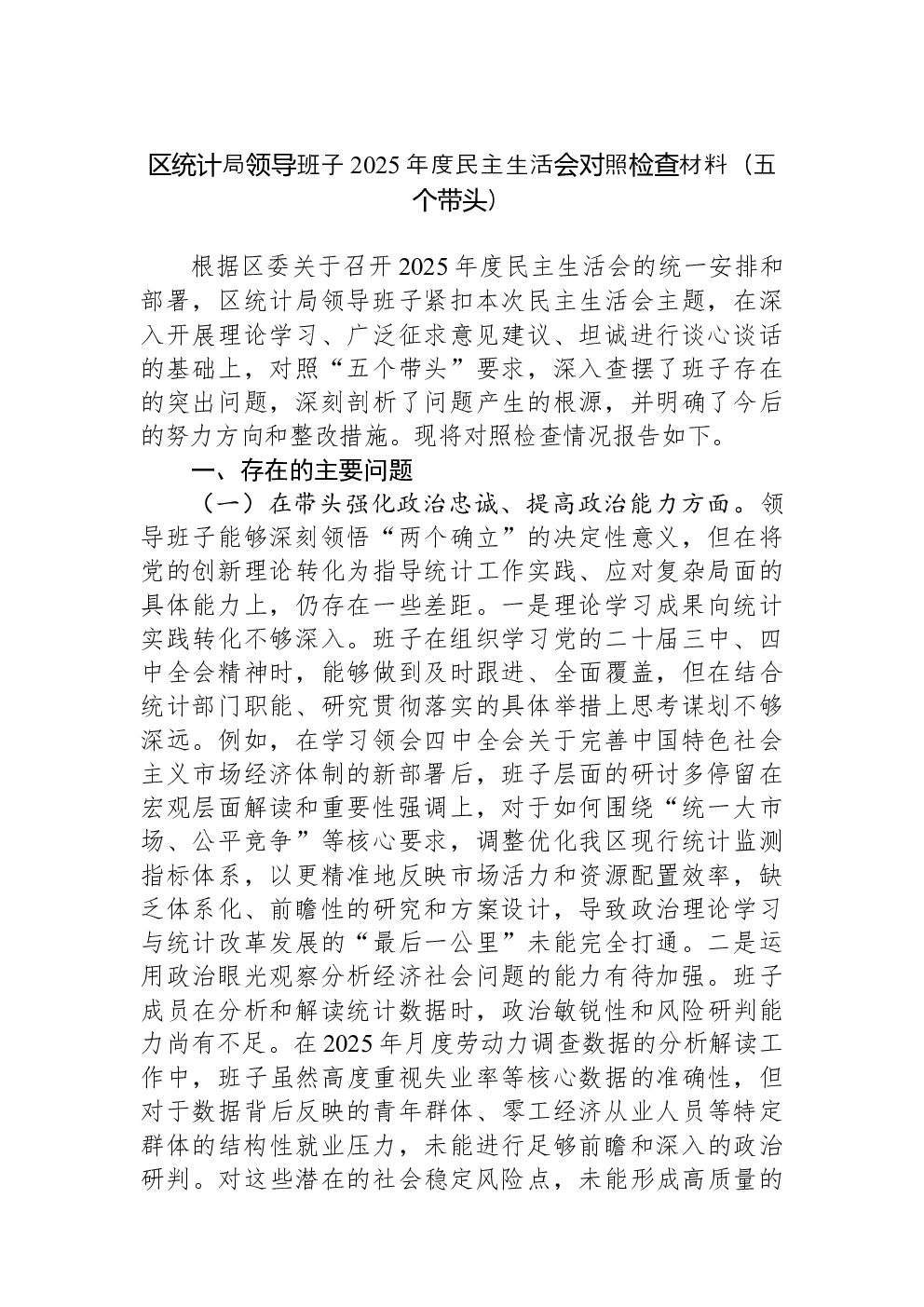 领导班子2022年民主生活会(六个带头)对照检查材料