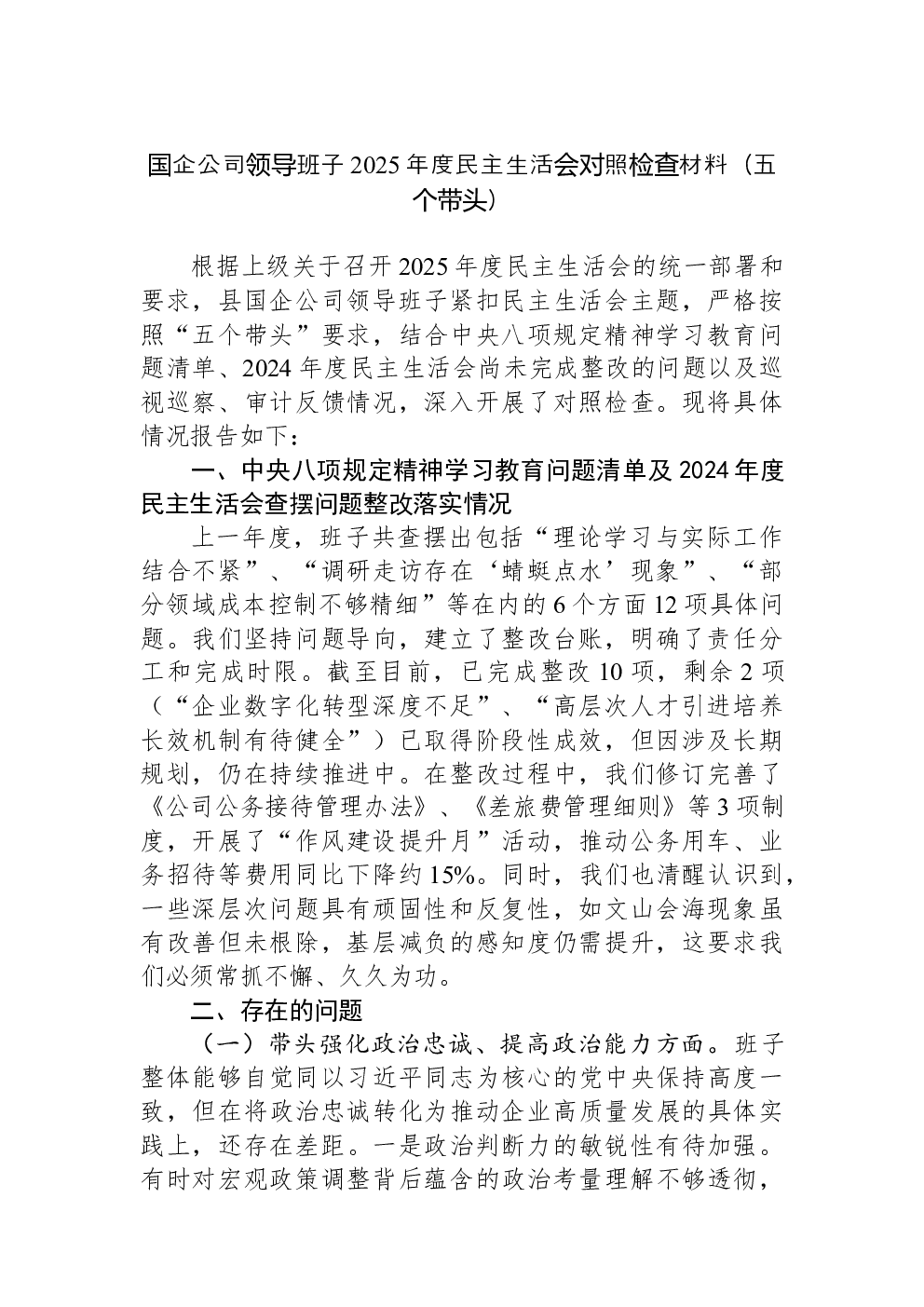 领导班子2022年民主生活会(六个带头)对照检查材料
