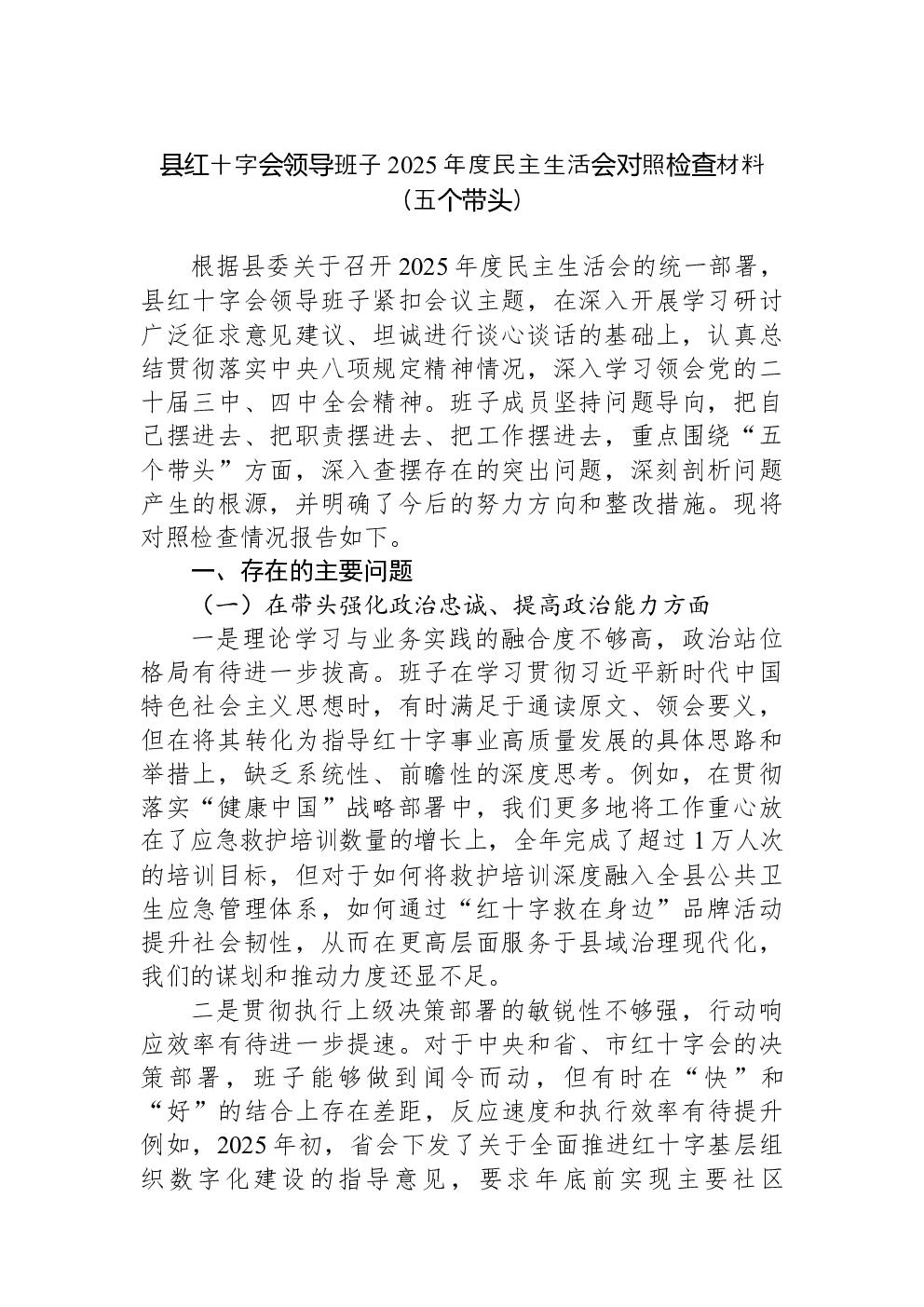 领导班子2022年民主生活会(六个带头)对照检查材料