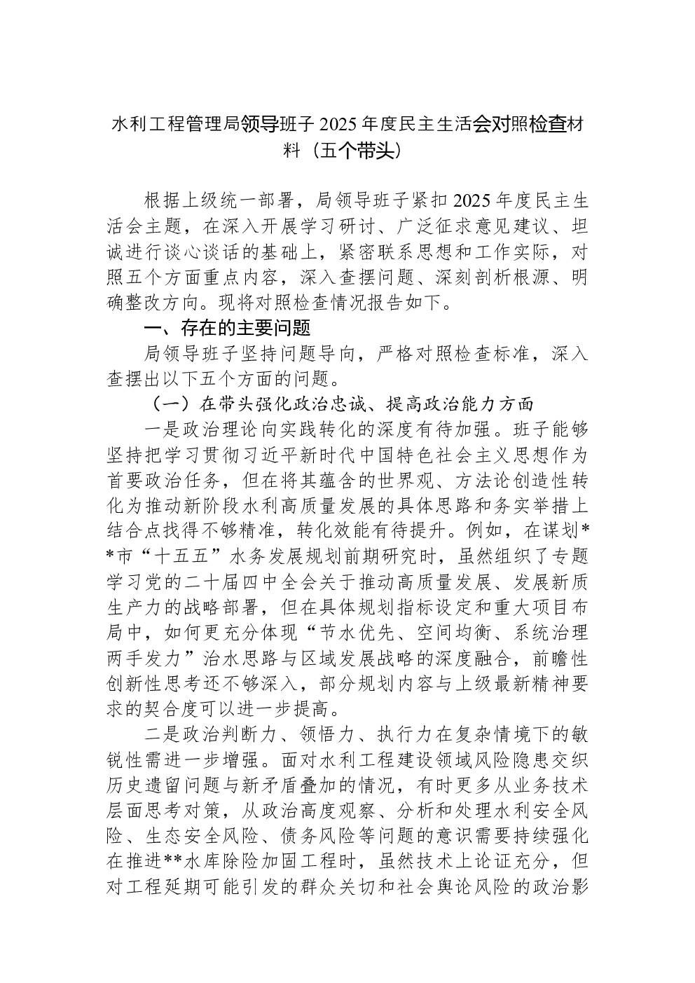 领导班子2022年民主生活会(六个带头)对照检查材料