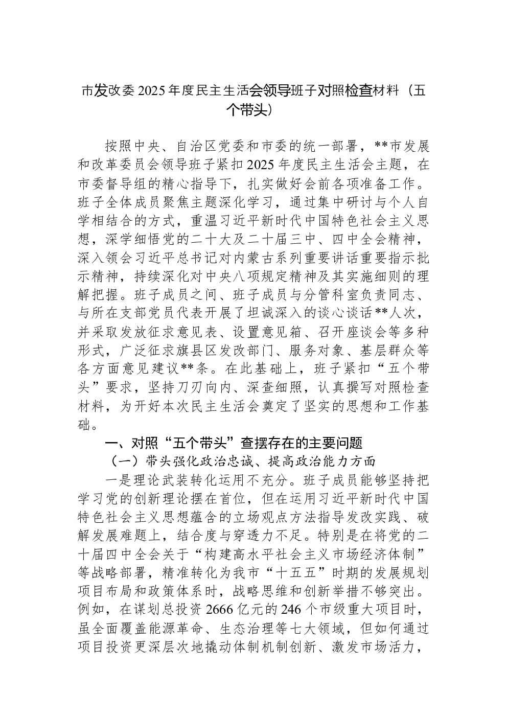 领导班子2022年民主生活会(六个带头)对照检查材料