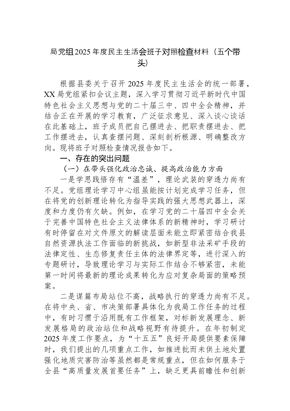 领导班子2022年民主生活会(六个带头)对照检查材料