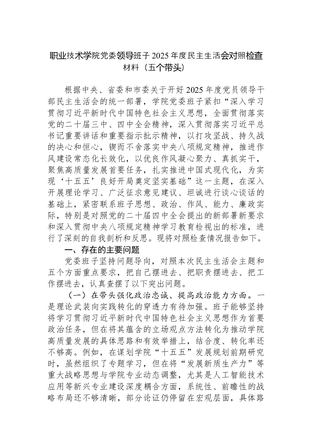 领导班子2022年民主生活会(六个带头)对照检查材料