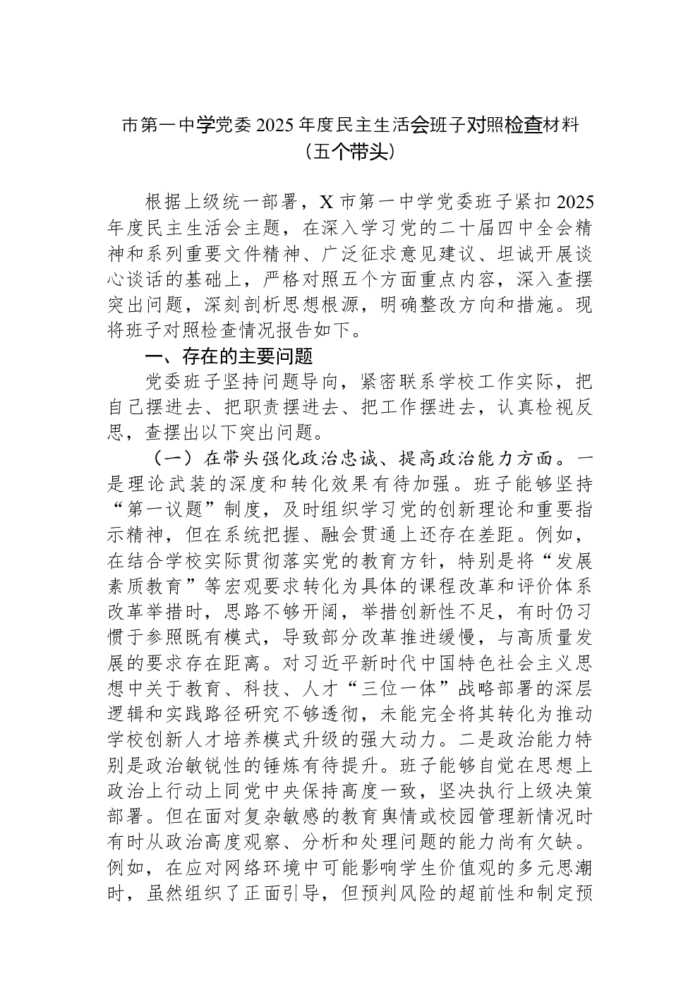 领导班子2022年民主生活会(六个带头)对照检查材料