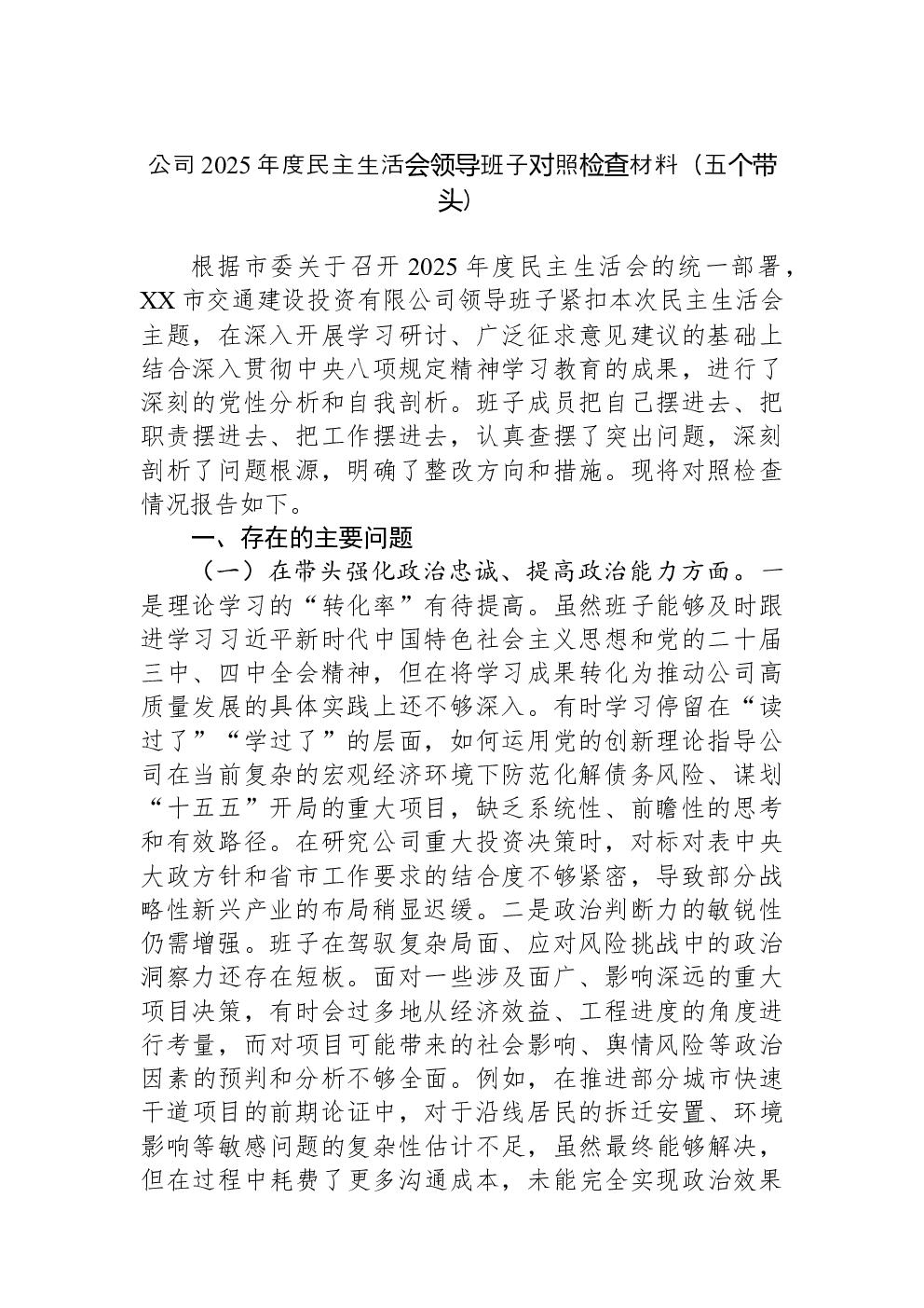 领导班子2022年民主生活会(六个带头)对照检查材料