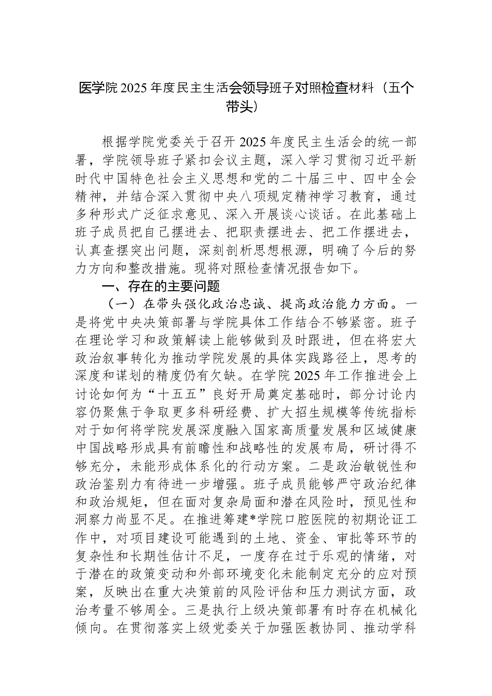 领导班子2022年民主生活会(六个带头)对照检查材料