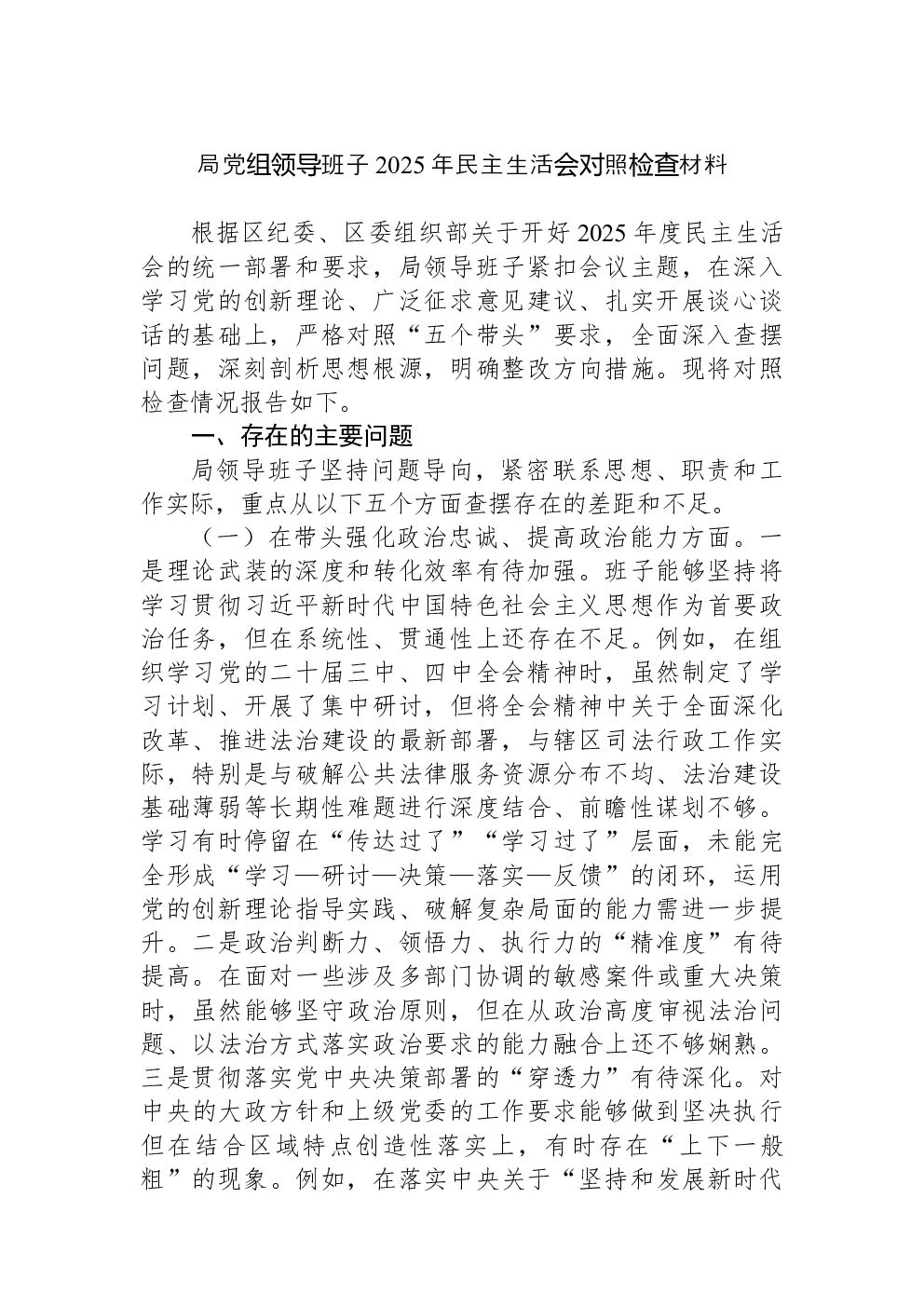 领导班子2022年民主生活会(六个带头)对照检查材料