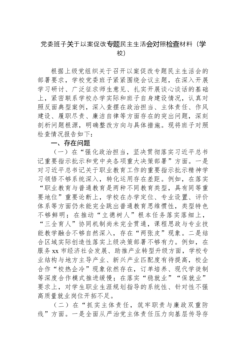 领导班子2022年民主生活会(六个带头)对照检查材料