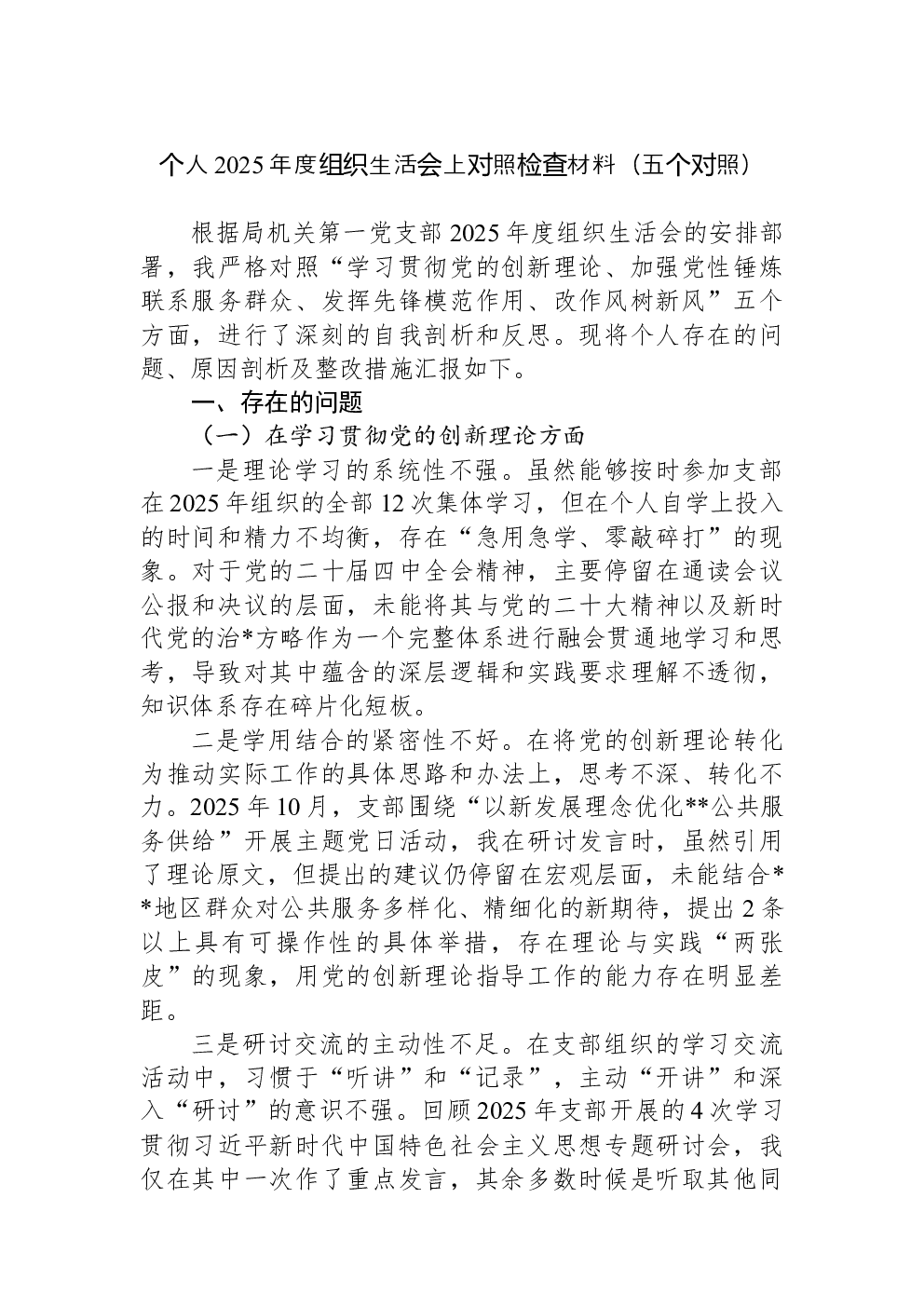 2022年度组织生活会个人对照检查材料(党员对照六个方面)